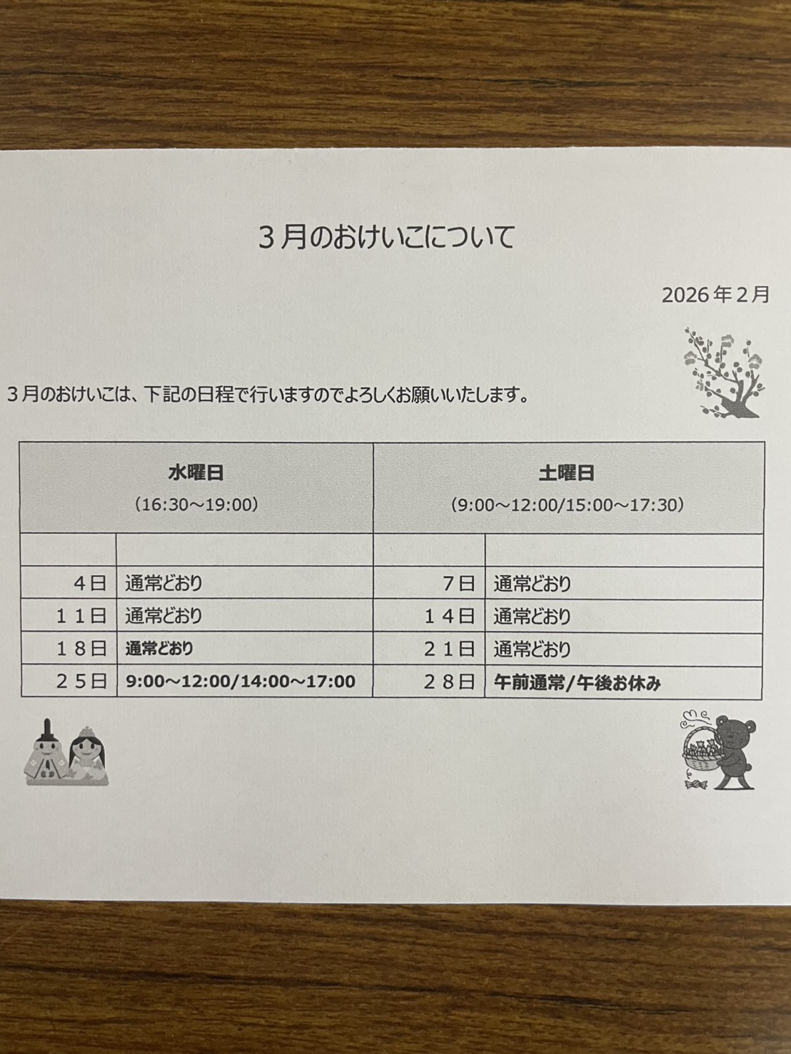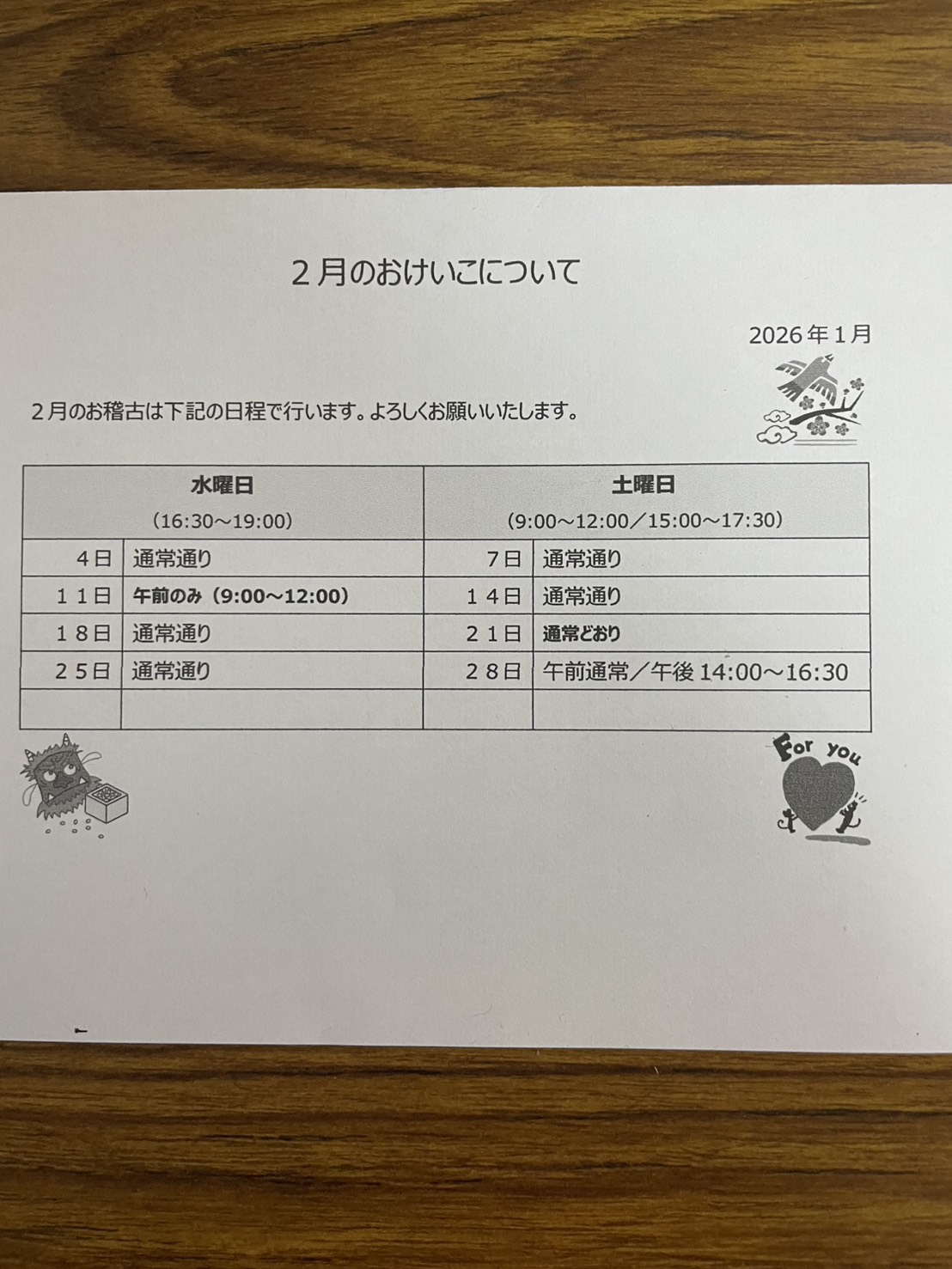 (ただし、祭日などお休みがあった場合は、振り替えておけいこを行います。) - 夏季(6月〜9月ごろ)、冬季(11月〜2月ごろ)は冷暖房費として1ヶ月200円頂きます。